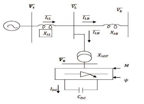 Figure 2 shows a single machine infinite bus power system connected with a STATCOM which consists of a Step-Down Transformer (SDT) with a leakage reactance XSDT , a three SDT phase GTO-based Voltage Source Converter (VSC) and a DC capacitor (Yadav et al., n.d; Shahgholian et al., 2008; Farahani et al., 2012).