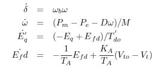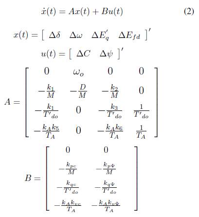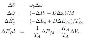 where, the state variables are the rotor angle deviation (∆δ), rotor speed deviation (∆ω), q-axis component deviation (∆E'q), and field voltage deviation (∆Efd).
