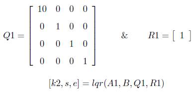 Second Stage LQR: A new state matrix A1 is obtained as A = A - (B * k1 ). With this knowledge find the second stage LQR controller, by changing the weighting matrices as,