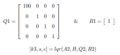 Third Stage LQR: A new another state matrix A2 is obtained as A2=A - (B * k2). With this knowledge find the third stage LQR controller by changing the weighting matrices as,