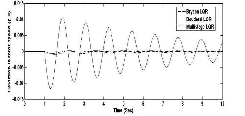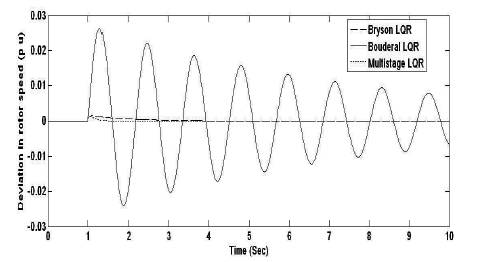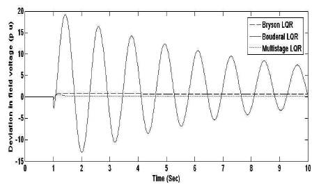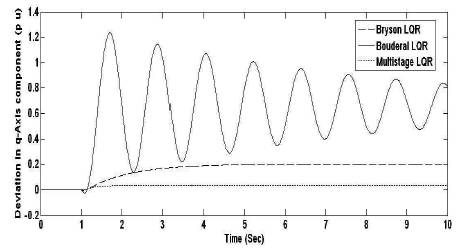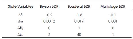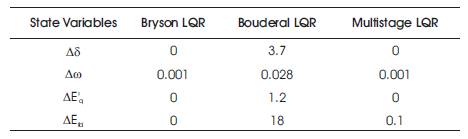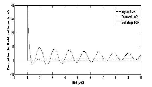 Figures 3 to 6 and Tables 1 and 2 show the improved performance in multistage LQR based technique compared to other techniques (Bryson and Bouderal) for the STATCOM control input ∆C for all the state variables. For another STATCOM control input ∆ψ, the multistage LQR optimal control provides robust performance compared to all other approches of LQR for the state variables, ∆δ, ∆ω, ∆E'q . But for the state variable ∆Efd using Bryson LQR, the settling time is better compared to other LQRs.