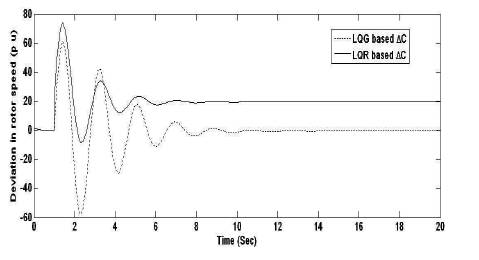 Figures 3 to 6 and Figures 7 to 10 show the simulation results of STATCOM control inputs ∆C and ∆ω with three different LQR approaches for the state variables ∆δ, ∆ω, ∆Eq' and ∆Efd , as mentioned in Scenario I. The comparison of two optimal controller (LQR and LQG) responses are shown in Figures 11 and 12 as stated in Scenario II. The comparison of peak overshoots (Mp) and settling time (Ts ) for Scenario I are tabulated in Tables 1 to 4. Tables 5 and 6 show the comparison of Mp , Ts and e for the two optimal feedback P controllers (LQR and LQG) when the disturbance acts on the system as mentioned in Scenario II.