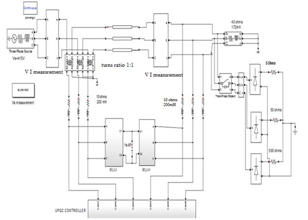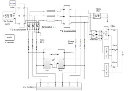 The validation of proposed configuration of UPQC is implemented in MATLAB/SIMULINK software. Voltage sag is created by applying rectifier R-L load using three phase breaker. Due to rectifier load, the harmonics are created and this is the main source of harmonics.