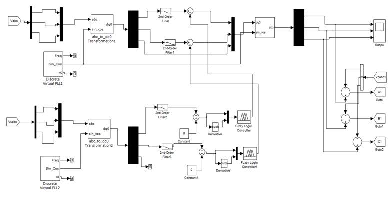 1.2.1 Series ControllerThe series controller can mitigate voltage related problems. The compensation of series APF is the difference between source voltage and load voltage (Vse =Vsource –Vload). The design of controller is based on dq0 (synchronous dq0) algorithm. First the source and load voltages Vsabc , Vlabc are transformed into Vdq0 by using parks transformation shown in equations (1), (2). The second order low pass filter (LPF) is used to filter out the higher order harmonics. The designing of series controller is as follows,