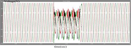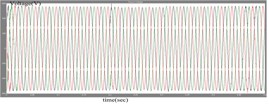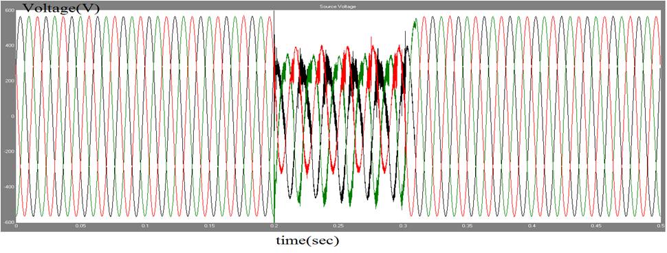A voltage source of 415V is supplied to the linear load of 100 ohms and 1mH. At the instant of 0.2, an unbalance three phase rectifier load is switched. The proposed control scheme will generate required pulses to multilevel inverters (switching frequency 1080Hz). The source voltage before compensation is given in Figure 8, and after compensation with multi-level UPQC is shown in Figure 9. By observing the results, PI and fuzzy logic controllers are more efficient, but FLC gives better performance. The voltage sag can actively mitigated through both the controllers. The source voltage compensation is shown in Figure 10, and source voltage with PI controller based UPQC is shown in Figure 11. The source voltage with fuzzy based UPQC is shown in Figure 12.