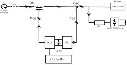 There are three main parts in the UPQC structure-they are inverter, controller, energy storage unit (DC source) [4],[5]. Inverter is used to convert DC to AC voltage, controller generates error signals and capacitor acts as a DC source. The regulation of capacitor can be maintained by the shunt APF. If we use capacitor as DC source, then there is only a reactive power exchange between supply and energy source through inverter [6,7,8]. If we use a fixed DC source then there exists only a real power exchange between supply and energy source. The proposed UPQC configuration is shown in Figure 1.