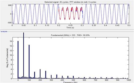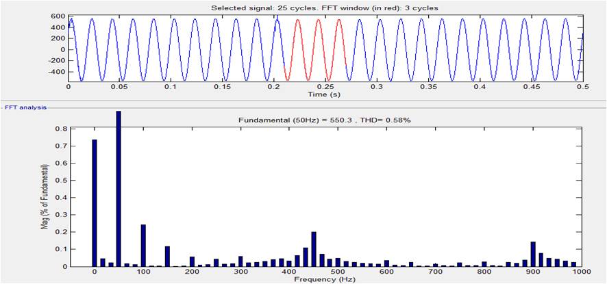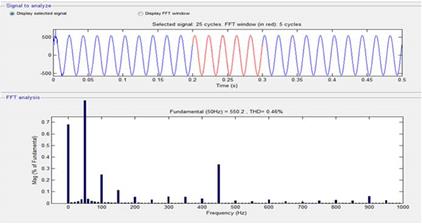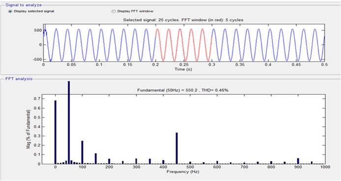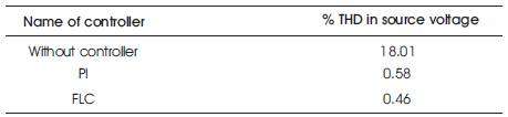 The harmonic analysis in the MATLAB can be done using FFT (Fast Fourier Transform) analysis with the help of Powergui block. Figure 13 gives the harmonic analysis of source voltage before compensation, Figure 14 gives the harmonic analysis of source voltage after compensation with PI controller and Figure 15 gives the harmonic analysis of source voltage after compensation with FLC controller. By observing the analysis, PI and fuzzy logic controllers are efficient but FLC controller is better compared to PI controller with appropriate rule base. The designed fuzzy logic controller has 25 rules in rule base. The Syncronous Reference Frame (SRF) theory was implemented using a Fuzzy controller with triangular membership function to obtain the fuzzified input to the controller and the controlled output is defuzzified using Centroid method. The harmonic analysis is listed in Table 3.