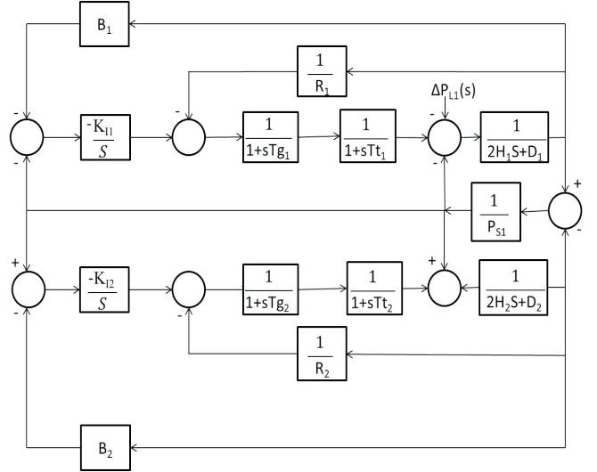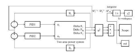 The control system that is used in this paper is two area power system [1]. The linearized model of the controlled system is shown in Figure 1 and system parameters are given in Appendix A. In the model, ΔPL1 is step load changes in area 1. Δf1 is frequency deviation in area 1, Δf2 is frequency deviation in area 2 and ΔPtie is the tie-line power deviation. In two area system considered for study, the PID controllers with following structure is used.