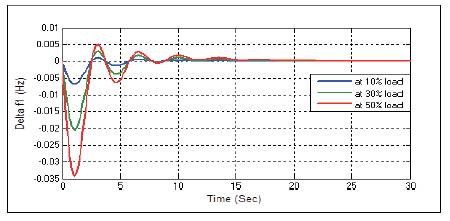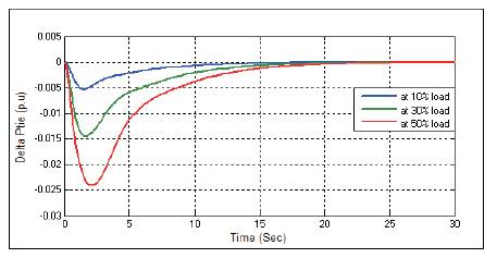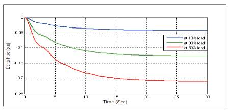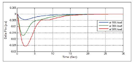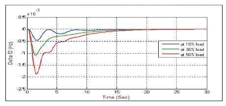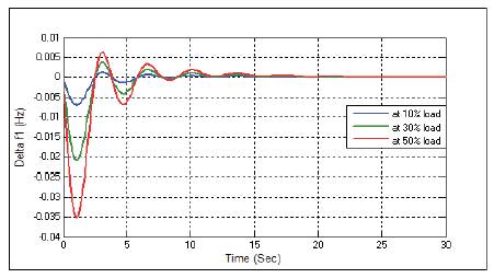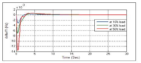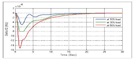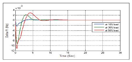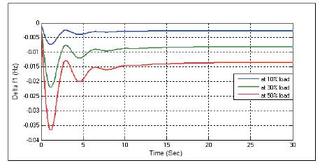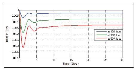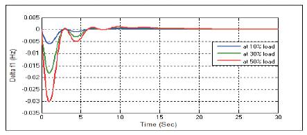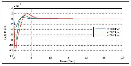 In this case the dynamic performance plots with integral (I) controller is analysed when one of the load parameter i.e. damping coefficient (D) is a variable (i.e., D=0.1,0.6 & 3) with variable load change ΔPL , (10%, 30% & 50%) with integral controller. Simulation results of frequency and tieline power responses are given below.