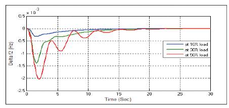 Figure 4. Change in Frequency Δf2 without any Controller at D=0.1