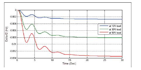 In this case the dynamic response plots without any controller are given. Two area thermal power system as shown in Figure 2 is studied for variable load damping coefficient (i.e., D=0.1,0.6 & 3) and variable load change ΔPL (10%, 30% & 50%) without any controller. Simulation results of frequency and tie-line power responses are given below.