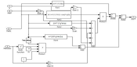 The parameters and constants are taken as: M=2.4Kg, m=0.23Kg,l=0.36m,g=9.81m/s2,k1 =25, k2 =10,c1 =1, c2 =2.6 [16,17]. Also xd = 0.1 m represents the desired position of the cart and θd =0 rad is the desired upright position of the pendulum rod. A Simulink model of the control law is developed and has been shown in Figure 3.