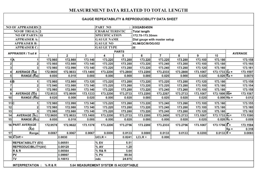 Chart InterpretationIn the present work, 10 parts (cylinder liners) numbered as 1 to 10 are considered and some of their critical parameters like total length and collar width are measured by three appraisers A, B, C. The numbering given to cylinder liners is not visible to the appraisers. The gauge of each part is calibrated according to the measurements procedures. Let appraiser A measures 10 parts in a random order and enter the results in row 1 of “gauge repeatability and reproducibility data collection sheet”. Let appraisers B and C measures the same 10 parts without seeing each other's readings, and then enter the results in rows 6 and 11 respectively. Repeat the cycle using a different random order of measurement. Enter data in rows 2, 7 and 12. Record the data in appropriate column. Steps 4 and 5 may be changed to the following when large part size or simultaneous unavailability of parts makes it necessary: Let appraiser A measure the first part and record the reading in row 1. Let appraiser B measure the first part and record the reading in row 6. Let appraiser C measure the first part and record the reading in row 11. Let appraiser A repeat reading on the first part and record the reading in row 2,appraiser B record the repeat reading in row 7, and appraiser C record the repeat reading in row 12. Repeat this cycle and enter the results in rows 3, 8 and 13. An alternative method may be used if the appraisers are on different shifts. Let appraiser A measure all 10 parts and enter the reading in row 1. Then appraiser A have to repeat reading in different order and enter the results in rows 2 and 3. Do the same with appraisers B and C. The average values of 10 parts in a particular row is calculated and entered into the corresponding cell in the right of a row. Similarly the average values in a particular column is calculated and entered into the corresponding cell at the bottom of the column. Table 1 shows the total length calculations for GRR Sheet.