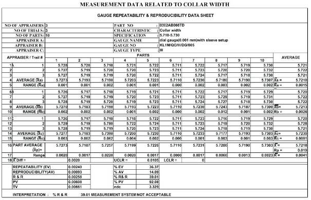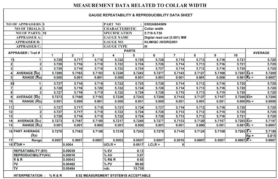 Calculations of GRR sheet for collar width is represented in Table 2.