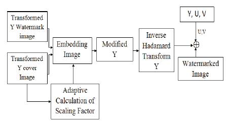 An adaptive watermarking method based on embedding and extracting a digital watermark into/from an image is done using a hadamard transform. Hadamard transform is mainly used for its robustness against image processing attacks. In this method an adaptive procedure for calculating scaling factor or scaling strength is used in hadamard transform. The scaling factor value is controlled by a control parameter. As per the users' requirements the inserted watermark may be either visible/invisible based on the control parameter. The results are compared with the existing system. The proposed scheme confirms the efficiency by the experimental result and performance analysis.