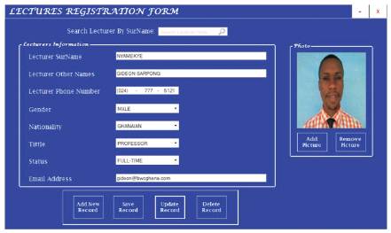 Lecturers of the Department information can be stored using this form. Their names, photographs, emails, addresses, telephone and mobile numbers, etc. can be saved into a secured database from here. The information can be retrieved at any point of time if the program is on. Screenshot of the form is shown in Figure 10.