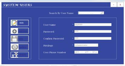This is part of the program that allows users of the software to be created. Here, users' information can be deleted or modified. System Users form is shown in Figure 5.
