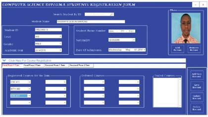 This section allows the user of the program to register degree students from the department. Currently, there are three degree programs offered under the Department of Computer Science. It also allows adding new record of students and modification of courses to be made. The user can add new student information, query student information, add images, and register student courses (deferred, trailed and current courses) and relevant details. Below is a screenshot of the Computer Science registration form. Similar ones are there for the Computing -with -Accounting Students and Information Technology Students. Figure 6. shows the Registration Form.