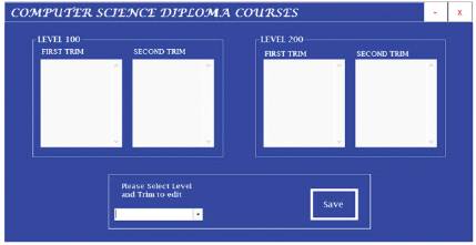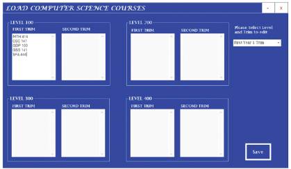 Here, the degree courses offered in the department are added and stored. This reflects in the registration form of the Degree Students. Courses can be loaded from each year (level). Since there are only three degree programs offered in the department of computer science, only three choices are available. Loading or editing courses for Computer Science courses, Computing-with-Accounting courses and Information Technology courses. Screenshot of the load courses is below in Figure 8.