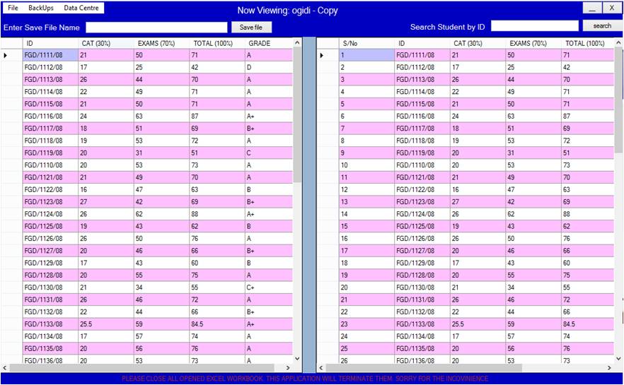 The Results API is used to load results from an excel sheet into the program. From here, the user can edit the content by using a menu item known as Edit Data or save the data read from the excel sheet into an Access Database which could later be retrieved by the program. This means that the program can read any access database file into it. It is good to note that the program only reads the excel sheet starting from a specific point into the program and does read only sheets and not the entire workbook of the excel file.