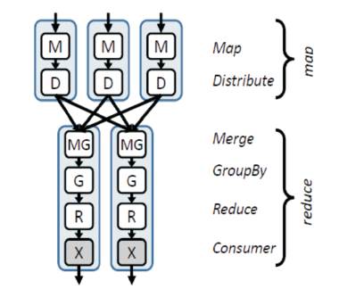 Group-By-Aggregate has emerged as a canonical execution model in the general-purpose distributed computing literature. Systems like MapReduce and Hadoop allow programmers to decompose an arbitrary computation into a sequence of maps and reductions, which are written in a full- edged high level programming language (C++ and Java, respectively) using arbitrary complex types.
