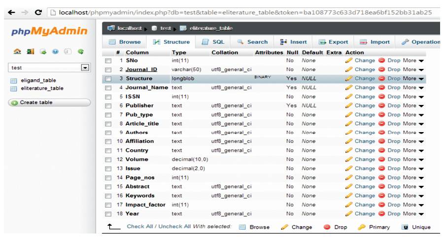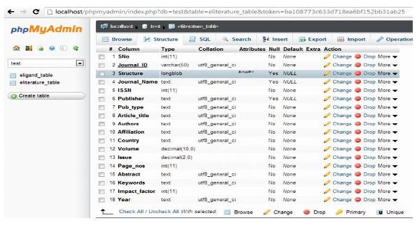 The e-literature table was created in MySQL database with all possible entries and the image is given in Figures 1 and 2. Entry items, such as ISSN, Publisher name, publication type (research/review/case study) are incorporated.