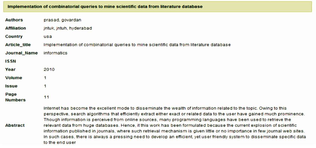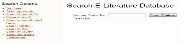 Mining data from database requires defining search algorithm to mine data using the user supplied specified input of keywords. Literature data, in general is huge and enormous in size owing to the submission of research and review papers being published in various journals of scientific significance. It should be noted that the data is also diverse and more informative. Hence journals which publish such information from authors have been diversified from general to more specific based on the field of study. Hence, to mine information, it is deemed to be necessary to implement robust and user friendly search functions. Search scripts are written in java in most of the cases. As we can see from available online databases, PHP and java scripts are used.
