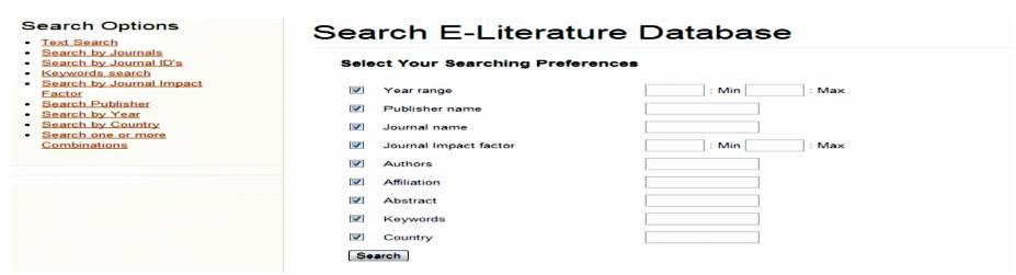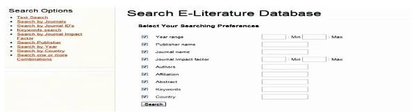 Mining data from databases have seen many upgrades since few decades considering the development of huge data repositories with the advent of internet revolution worldwide. Inherently, the importance of search algorithms to mine data has gained prominence over a period of time. Many programming languages have been used to retrieve relevant information from databases. In this paper, the author presents the E-Literature database created in MySQL with all possible entries, such as ISSN, Publisher name, publication type, etc. Authors from different geographical regions can also be searched from the database. The search algorithm code implemented in the work is used to search the database with varied options, such as 'Abstract', 'keywords', 'affiliation', 'country', 'ISSN', etc. Each search option and the relevant code were written in PHP. Binary search algorithm has been implemented in the work to perform search routine. Apart from general search option, a robust search method which combines various search combinations called 'combination search' can be used to efficiently mine data.