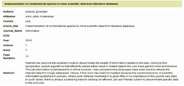 In order to develop a local database, abstract related data was extracted from PubMed database [ 7] and Google Scholar [4]. PubMed is a freeware of National Center for Biotechnology Information (NCBI) maintained at the National Library of Medicine (NLM). PubMed provides with accessibility for ease in searching certain topics using generic mechanisms, using MeSH terms, publisher's name, title, patterns, phrases, names of publications, etc. Google Scholar was used to retrieve subject specific data and the extracted information was stored in e-literature database.