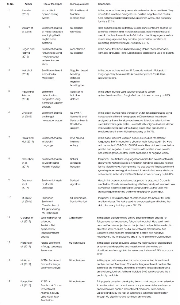 Fourteen earlier papers have been studied to understand the Sentiment Analysis on Indian Languages. Table 1 presents the work on Sentiment Analysis for Indian Languages.