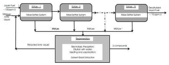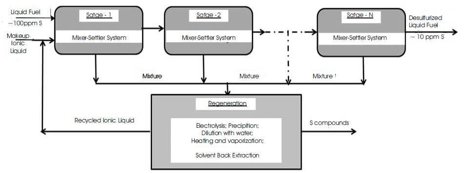 It is difficult to reduce the sulfur content to a permitted level (< 50 ppm) in single stage extraction. Therefore, a multiple extraction is desired to investigate the ultimate extractive performance of ILs. In multistage extraction, the desulfurized model oil from the first extraction step is again treated with fresh or regenerated ionic liquid. This may be repeated up to 3-5 times to reach low sulfur level. The typical mixer-settler approach of multistage extractive desulfurization of liquid fuel using ionic liquid is given in Figure 3.