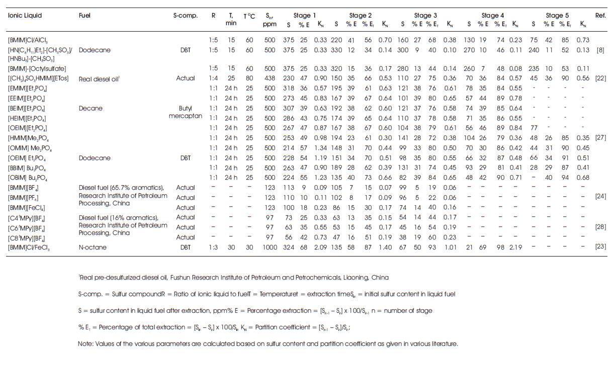 Yu et al. [25] observed remarkably sulfur dropped to 17 ppm after five extraction stages from model fuel (549 ppm sulfur in 85% n-hexane + 15% toluene) by [C2MIM][N(CN)2] for extraction time, 20 min and 1:1 mass ratio at room temperature, 25OC. Almost 97% sulfur removal efficiency was obtained. Chen et al. [26] observed that the sulfur content in gasoline (thiophene in 85% n-hexane + 15% toluene) drops drastically from 558 ppm to 20 ppm after five stages and the sulfur content in diesel (DBT in n-octane) fuel is reduced from 547 ppm to 8 ppm after 4 cycles. The results of multistage extraction for desulfurization of liquid fuel using various ionic liquids are summarized in Table 1.