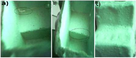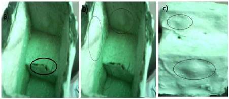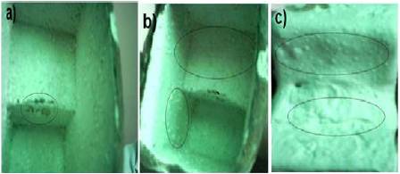 Figure 10. a) Internal Surface Finish and Break of Shell b) Crack c) External Surface Finish