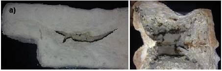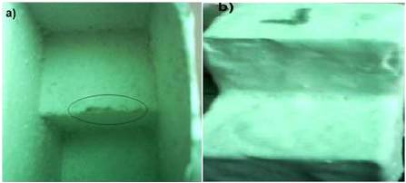 Figure 5. Applying, Direct High Temperature. a) Formation of crack on wall (External View). b) Bending and expansion of shell and uncompleted foam decomposition (Internal View).