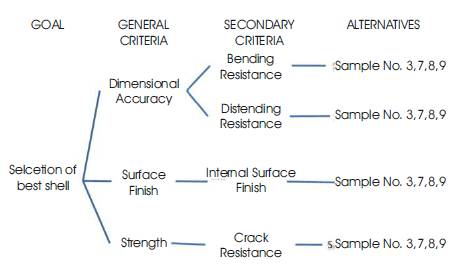 According to General Marking Method, selected alternatives (sample no. 3, 7, 8 and 9) are used in AHP. For these alternatives and properties of shells, Saaty's Hierarchy Tree has been shown in Figure 20.