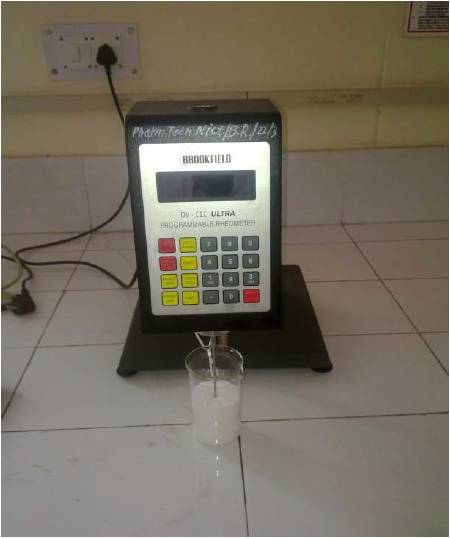 The viscosity of slurry is measured by Rheometer which is shown in Figure 3. The working operation of the Rheometer (DV-III Ultra) is to drive a spindle (which is immersed in the test fluid) through a calibrated spring. The viscous drag of the fluid against the spindle is measured by the spring deflection. Spring deflection is measured with a rotary transducer. The viscosity measurement range (in centipoises or cp) is determined by the rotating speed of the spindle, full scale torque of the calibrated spindle, the size and shape of the spindle and container in which the spindle rotates. The range of speed and temperature sensing are 0.01 to 250 rpm and -100 to 300°C respectively. The viscosity of coating slurry is measured at 28°C and 100 rpm for all twelve samples.