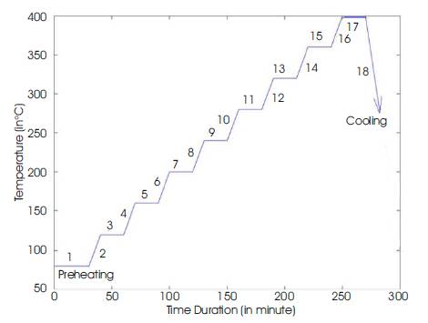 In this method, first, shell is preheated at 80°C for 30 minutes. After preheating, the temperature raises up to 120°C at a rate of 4°C/ minute. Shells are heated at constant temperature (120°C) for 20 minutes. Again the temperature rises up to 160°C at a rate of 4°C/ minute for 10 minutes and then heated at constant temperature for 20 minutes (as shown in graph). This process is repeated till foam does not evaporate completely. Figure 6 shows the graph between temperature and time. Shells have been created which are shown in Figure 7.