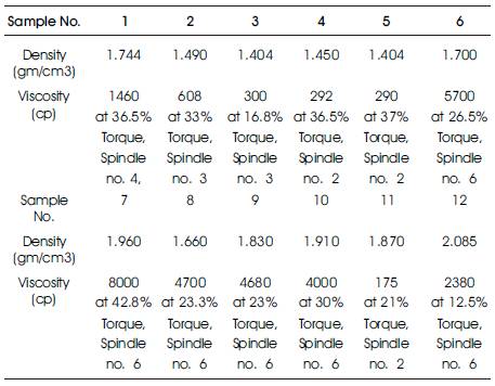 Density of slurry of different composition has been calculated. The viscosity of slurry has been directly recorded for twelve samples from rheometer. These are shown in Table 2.