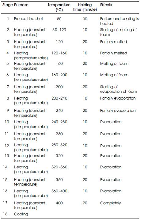 Coated patterns are kept in a furnace at high temperature directly, then shrinkage rate will be fast and forms crack in shell. This problem can be minimized with the help of preheating and slow rise in temperature. The effects on shell, produced by foam removal process, have been investigated for each stage which are given in Table 3.