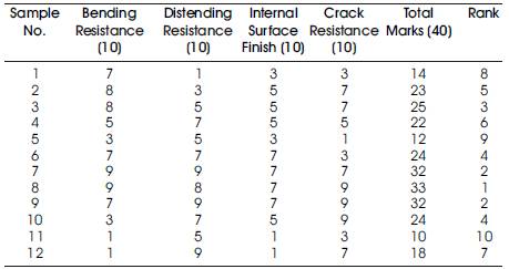 This method is one of the simplest method in which all factors or criteria are allotted equal mark (ten marks) and the quality (property) of alternatives are assigned a number (obtained marks) out of maximum marks. Basically, this method is used to eliminate very bad alternatives for making easy and simple calculations. In this study, there are four very important factors (Bending/ Expansion Resistance, Distending Resistance, Internal Surface Finish and Crack Resistance). Twelve alternatives are used. Four good samples are selected by using this method.