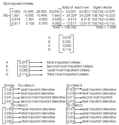 Here very bad samples (eight) are eliminated by using general marking method and rest four samples have been evaluated by AHP. So, four alternatives have been selected for further analysis.