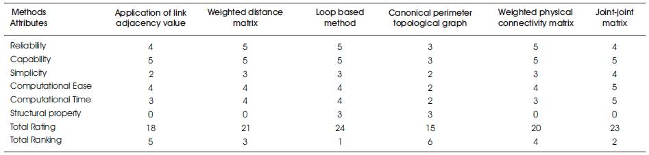 The total rating of the above six methods are based on comparison from above six attributes such as Reliability, Capability, Simplicity Computational time, Computational ease and Structural property are shown in following Table 1.