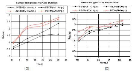 Figure 12a-b. Effect of ultrasonic vibration on average surface roughness for ultrasonic EDM and pure EDM with (a) pulse-on time and (b) discharge current [23]