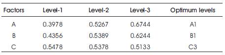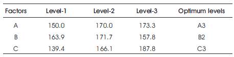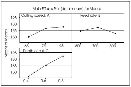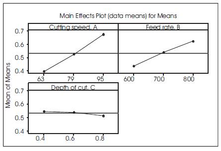 The effect of different machining parameters on AISI 304 stainless steel can be studied by using response graph and response table. The mean response values for each level of parameter on surface roughness is calculated and presented in Table 5. Based on the mean response values presented in Table 5, the influence of cutting parameters on surface roughness is graphically shown in Figure 2. From Figure 2, it is realized that surface roughness increases with increasing the cutting speed and feed rate, whereas surface roughness decreases with increasing the depth of cut. Based on the response table and response graph for surface roughness, the optimal combination of process parameters for minimum surface roughness is obtained at 63 m/min cutting speed, 600 mm/min feed rate and 0.8 mm of depth of cut (A1 B1 C3).