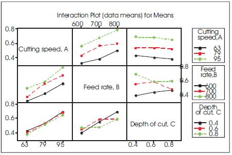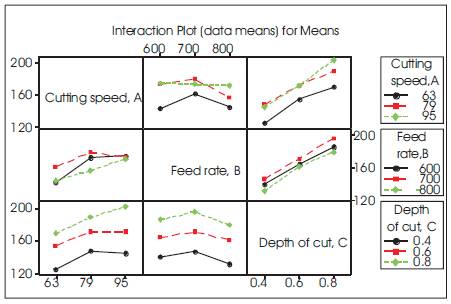 The interaction plots for Material Removal Rate which is shown in Figure 5 are between cutting speed and feed rate (AxB), between cutting speed and depth of cut (AxC), and between feed rate and depth of cut (BxC). It is observed from the interaction plots for Material Removal Rate that there is a less interaction effect between cutting speed and feed rate (AXC).
