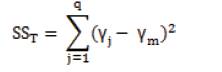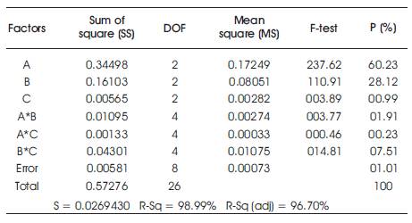 The purpose of the statistical ANOVA is to investigate which design parameter significantly affects the performance characteristic. This is accomplished by separating the total variability of the output response value, which is measured by the sum of the squared deviations from the total mean of the output response value, into contributions by each machining parameter and the error. First, the total sum of the squared deviations SST from the total mean of the output response value Ym can be calculated as,