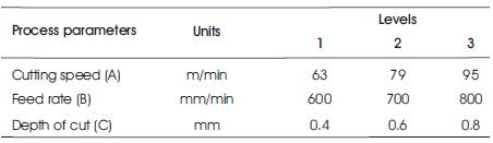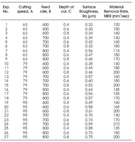 To perform the experimental design, a total of three parameters namely cutting speed (A), feed rate (B) and depth of cut (C) were chosen for the controlling factor, and each parameter is designed to have three levels, namely low, medium, and high, denoted by 1, 2 and 3, as shown in Table 3. It was also decided to study the two factor interaction effects on multiple performance characteristics. The selected interactions were between cutting speed and feed rate (AxC), and between feed rate and depth of cut (BxC). To select an appropriate orthogonal array for the experiments, the total Degrees Of Freedom (DOF) need to be computed. With three parameters each at three levels and three second-order interactions, the total degree of freedom required is 18, since a three level parameter has 2 DOF and each second order interaction has 4 DOF (Product of DOF of interacting parameters). As per Taguchi's method, the DOF for the orthogonal array should be greater than or equal to the total DOF required for the experiment. In this study, an L27 orthogonal array having 26 DOF (Number of trials -1) was selected. The experimental combinations of the machining parameters using the L27 orthogonal array are presented in Table 4.