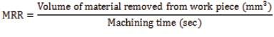 The responses considered in this study were surface roughness (Ra) and Material Removal Rate (MRR). Surface roughness can generally be described as the geometric features of the surface. The surface roughness was evaluated using a Mitutoyo Surf test 211 with the cut-off length set as 2.5 mm. Each trail was repeated for three times and the average roughness values were obtained. Material removal rate is used to evaluate a machining performance. Material removal rate is expressed as the amount of material removed under a period of machining time and is calculated using the formula given in Equation 1: