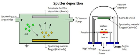 Sputtering deposition technique is most commonly used method for thin film deposition. Figure 4 shows the sputter deposition method (Callister & Rethwisch, 2007). In this method, particles are ejected from target source and get deposited on substrates such as silicon wafer, SS304, glass, and polycarbonate materials. These sputtered atoms possess broad energy distribution normally up to 9.5-10 eV. In processing of thin films, usually argon gas is used as sputtering gas due to higher molecular weight of argon. While sputtering light and heavy elements sputtering gases such as neon and krypton/xenon is preferred. In thin film deposition process, it is essential to scrutinize that for efficient momentum transfer of ions from target to substrate, atomic weight of sputtering gas should be almost equal to atomic weight of target source.