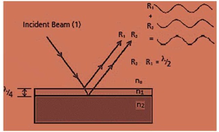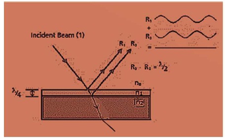 As light travels through an optical component, reflections will occur at two interfaces of index change on either side of the coating. In order to minimize reflection, ideally there should be 180° phase shift between these two reflected waves when they recombine at the first interface. This phase difference correlates to a λ/2 shift of the sinusoidal wave, which is best achieved by adjusting the optical thickness of the layer to λ/4. Figure 8 shows an illustration of Destructive interference (Bachman, Chiang, Chu, & Li, 1999).